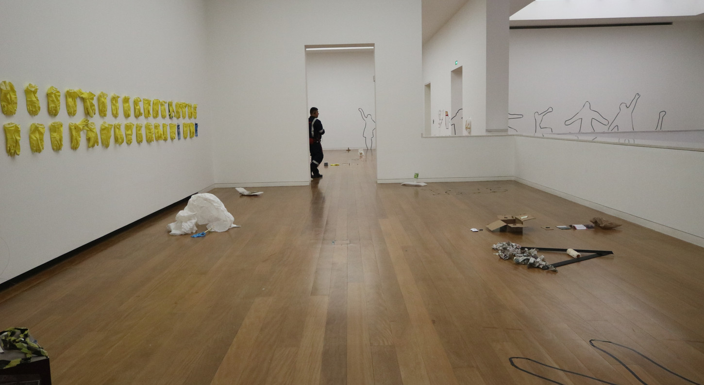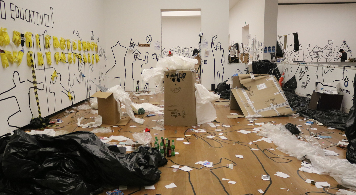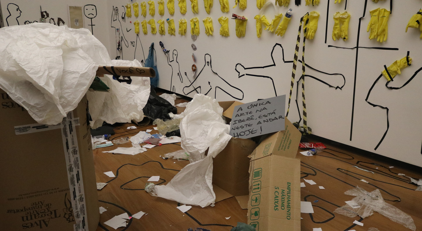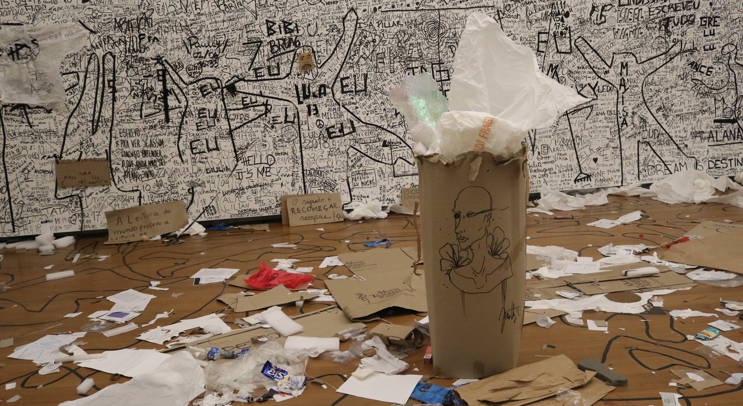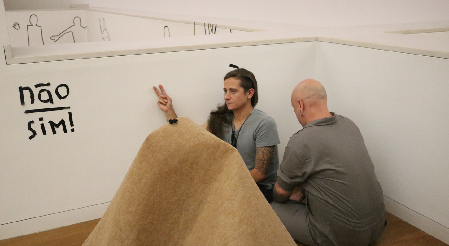 Action-instalation created in collaboration with the artist Maurício Ianês. By turning the institution inside out, this piece questions how the relations inside and artistic institution space are created, amplifying the possibilities of creation and distribution of the sensible in a transparent and collective way, where the affection that passes through, pulls apart or brings closer this temporary presences are revealed and amplified in a space of political and aesthetic discussion and creation. With two months of duration, the public and the workers of the museum were invited to participate in four actions. By the end of this period it resulted in rooms filled with names, body markings and sculptures made out of residue, creating a huge action-installation in process.
